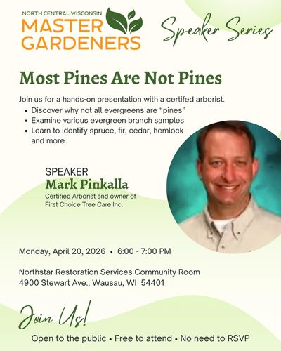 The North Central Wisconsin Master Gardeners Association (NCWMGA) invites community members to attend its upcoming educational program. Most Pines Are Not Pines, on Monday, April 20, from 6:00 to 7:00 p.m. The program will be held in the Community Room at NorthStar Restoration Services, 4900 W. Stewart Avenue, Wausau.