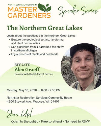 The North Central Wisconsin Master Gardeners Association (NCWMGA) invites community members to attend its upcoming educational program. The Northern Great Lakes, on Monday, May 18, from 6:00 to 7:00 p.m. The program will be held in the Community Room at NorthStar Restoration Services, 4900 W. Stewart Avenue, Wausau.